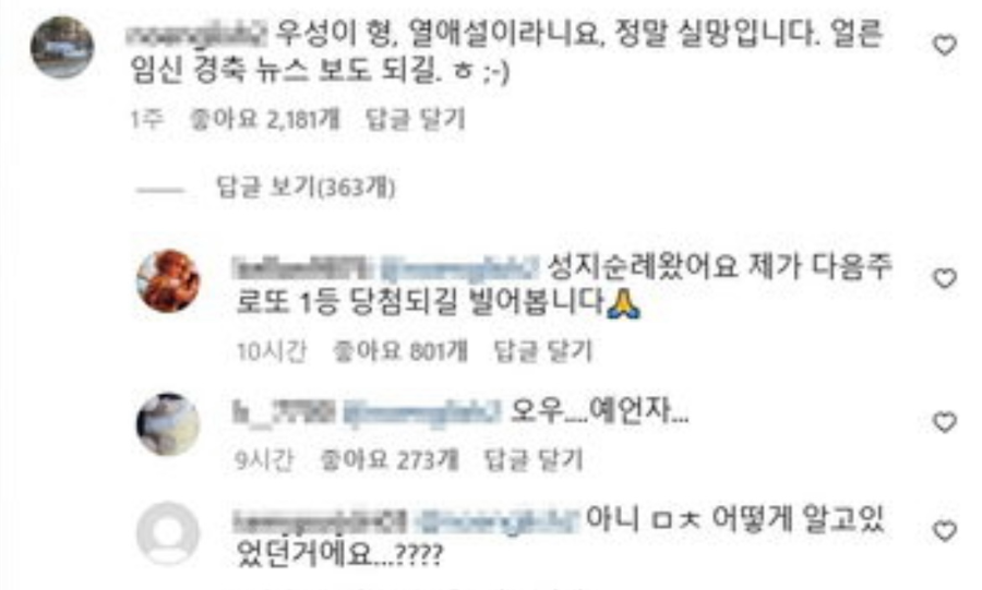“우성이 형, 열애설 말고 임신 경축 보도 기다립니다", 재조명된 네티즌 댓글 📝